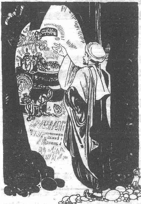 这样想着,他从树上溜下来,走到巨石前。他喊道: “芝麻开门!” 石头果然应声而开,露出了洞口。阿里巴巴走了进去,立即被眼前的景象惊呆了。那里有一堆堆码到洞顶的丝绸、锦缎和彩色毡毯; 无以数计的金币银币,有的装在袋子中,有的散落在地上; 满筐满箩的珍珠、宝石和各种首饰; 各类金银器皿和珍贵宝物。阿里巴巴一生从来没有见过这么多好东西。此刻他看得眼花缭乱,不知所措。他担心强盗们重返山洞,抓住他就会要他的命。于是赶紧装了三条毛驴能够驮得动的金币,匆匆跑出山洞。他说了一声: “芝麻关门!” 石头又回到原地。为了不使路人发现,阿里巴巴用柴草盖住了钱袋。