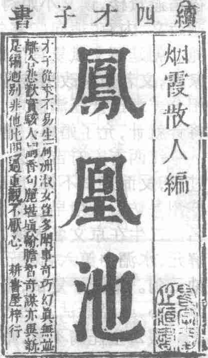 清代白话长篇才子佳人小说。全称《凤凰池续四才子书》,一名《续四才子书》,又名《才子奇缘》。十六回。题“烟霞散人编”。烟霞散人,或即刘璋,字于堂,号介符,又号樵云山人,山西太原人。成书于清康熙中后期。