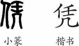 “凭”是会意字。楷书写作“凭”,从几,从任,会依几之意。