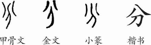“分”是会意字。甲骨文从八,从刀,会以刀分物之意。金文、小篆的形体与甲骨文大致相同。隶变后楷书写作“分”。