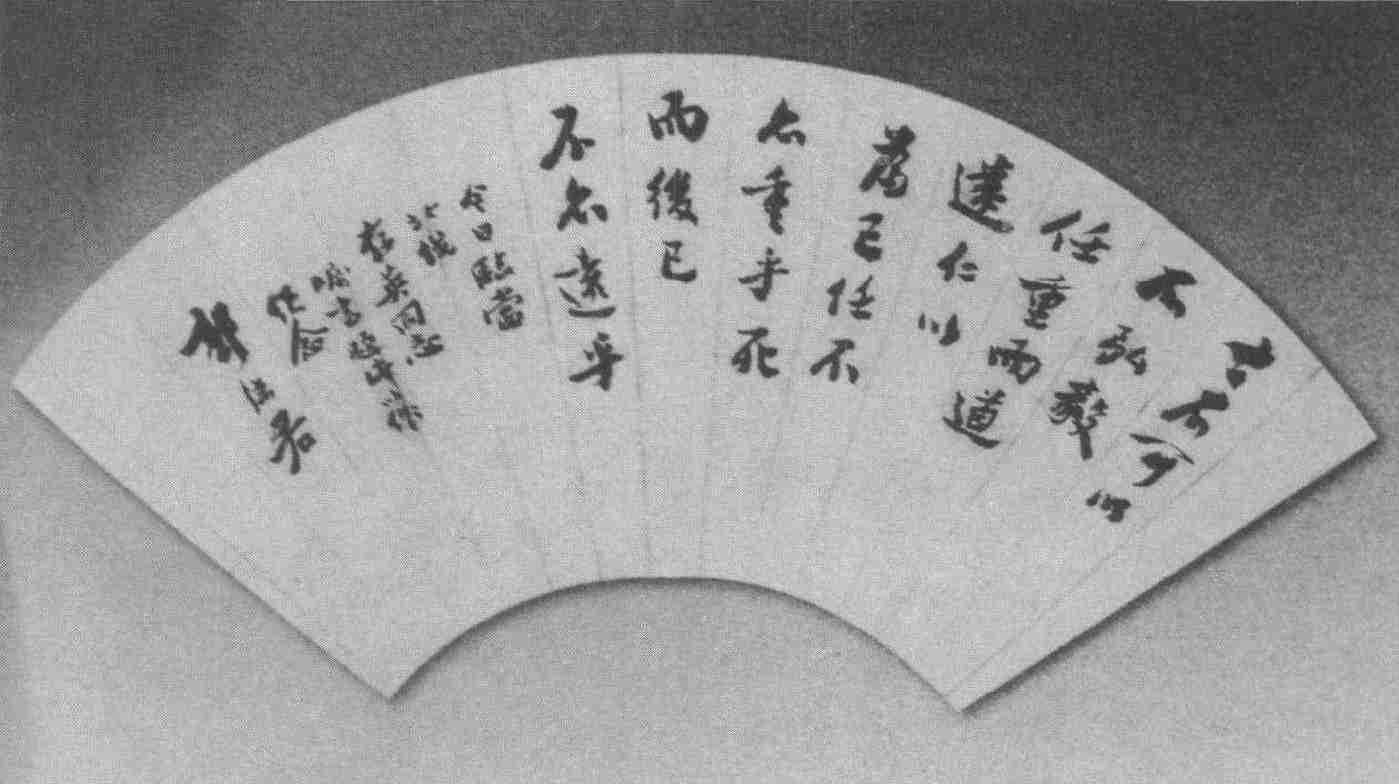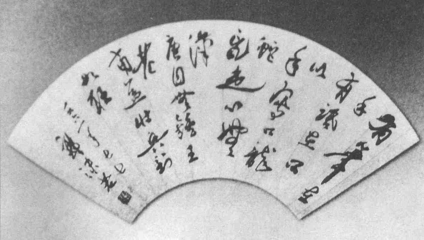 郭沫若是20世纪中国一颗耀眼的明星,从五四运动到粉碎“四人帮”以后,整整一个花甲,他总是站在社会变革的潮头。正因如此,他的豪宕超迈、雄奇洒脱便是其他书法家难以企及的。有人称郭沫若的字为“郭体”,说明他的书法确实特色十足。他曾把自己想象成一条天狗,要把月来吞了,要把日来吞了,要把一切的星球来吞了,要把全宇宙来吞了,因而他的字的主观色彩也非常强烈,可以说是自出机杼,先声夺人,充满了自我蹈励与张扬。但他毕竟不只是浪漫的诗人,还是渊博的学者,尤其对金文、甲骨文有很深的造诣,因而他的书法的功力是比较深的,这在他的书法扇面上也有充分的体现。虽然郭沫若擅长的行、草书水平不一,有时难免干枯稚弱,但总体来看仍是才华横溢。