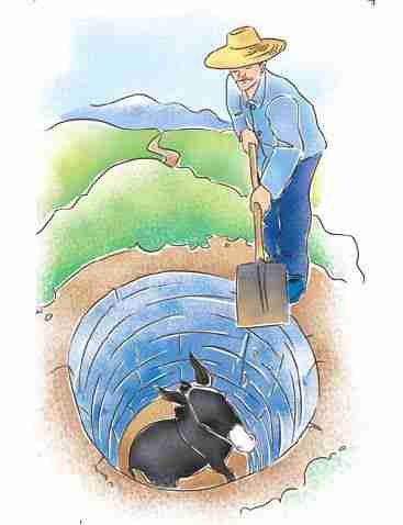 有一头驴子,失足掉到了一口枯井里,主人想尽办法也不能把它弄上来,听着它在里面悲惨地叫唤,想着它等死的痛苦,主人想帮它早点解脱,遂找来两三个人,开始往井里填土,想结束驴子的生命。