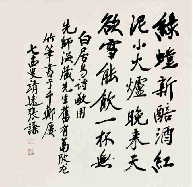 张谦的书法苍劲浑厚。笔者藏有他的几件特殊的书法作品,言其特殊,盖因先生均未按常规方法写就,也可称其为戏作,但这种特殊的戏作却更见功夫。如先生 74 岁时的那件作品是他用“先师海藏先生旧有葛陂龙竹笔”书写的,是为白居易的五言诗《向刘十九》。竹笔不过是以竹劈碎使顶端略软的竹片子,古人作书极少使用,偶有所用,亦大字书壁,罕有作于纸上者。张谦先生的这幅竹笔作品则是写在 1米见方的宣纸上的,笔姿既美,骨气亦重,字画间颇似毛颖所致,没有坚实的书法功底实难为之。