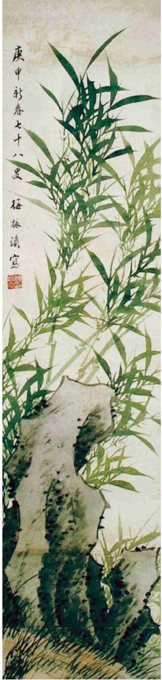 那是 2007 年 6 月,天津几大拍卖公司几乎是在同一时间举行文玩艺术品拍卖。我逐一翻阅图录,观看拍品,发现有两家拍卖公司都有梅振瀛的竹石图。一为高103厘米、宽 63 厘米的立轴,设色绢本,作于1925年,钤印“臣振瀛印”、“韵生”、“以书作画画作书”,题识“乙丑仲冬中浣拟文与可先生法,八十三老人韵生梅振瀛”。此画标底价6000 元至 7000 元。另一家拍卖的竹石图为高 91 厘米、宽 22 厘米的立轴,设色纸本,钤印“梅振瀛印”,题识“庚申新春七十八叟梅振瀛写”。底价标 800 元。如此算来,此画的底价仅为前者的 1/8。若按尺寸折合,前者为一平尺 1000 多元,后者为一平尺400多元。经过权衡比较,我参加了后一家拍卖公司的竞标,当拍至这幅竹石图时正好无人与我竞争,遂以 880 元(底价加佣金)购得。