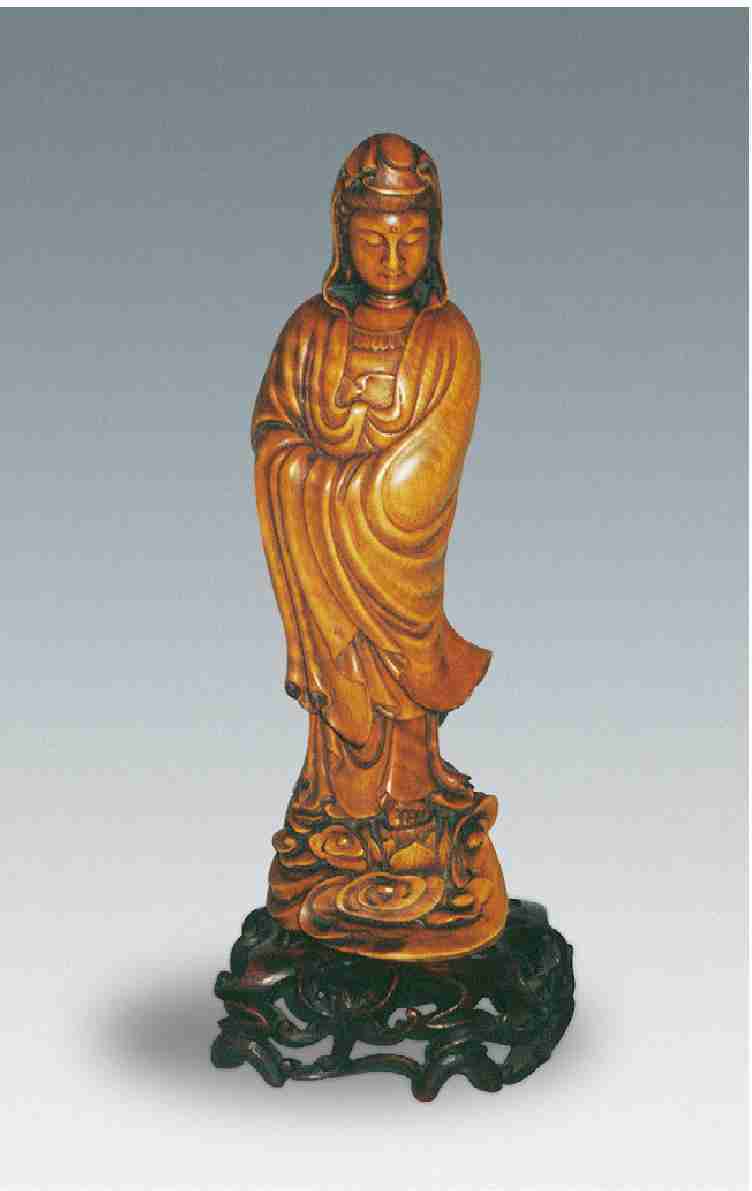 为了说明问题,我取出几件我个人收存的器物给他们看。 一件为老笔筒,此物好在形态上,扁圆异形,上雕楷书“竹解虚心是我师之句其味无味,莹陔一兄先生正疵,老圃生”,为清代文人手制,颇具文人气息。一件是紫檀木雕文官像,此为圆雕,刀法简洁,文官神情肃穆,表情严峻,宽袍长裙,端坐于台面之上,典型的明代作品,表面乃多年摩挲把玩而自然形成的包浆,明显露出陈年旧物之征。还有一件是黄杨木雕观音像。黄杨木质地坚致细密,纹理成斑纹状,绝非黄柏木等木质可比。此观音像面容安详、双目微合,身披天衣,赤足,人物肌圆滑润,呈现出柔和曲线,极富美感,虽属近代作品仍具收藏价值。