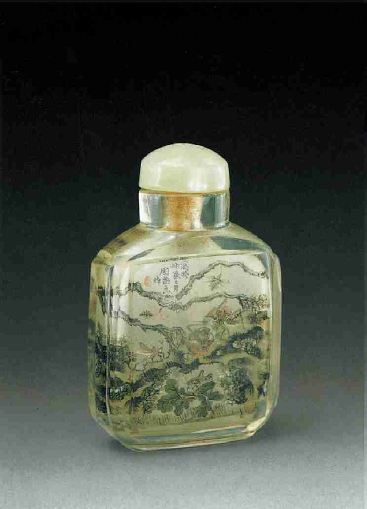 判定内画壶是否为名家作品首先要分辨鼻烟壶自身的质地,看一看壶的本身材料是否洁净、透明度如何及造型款式。其次要分辨这件内画壶的时代风格和个人风格。这一点至关重要。判定内画壶是否为名家所作,内画的风格和质量起着决定性作用,作为收藏者,只有真正了解内画名家的艺术特点,才能减少鉴别上的失误,才不致将假的当成真的,了解作者艺术的全貌方能看清他们作品的细枝末节。