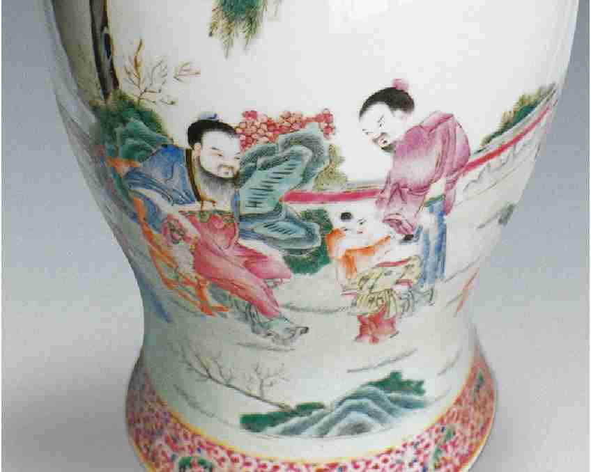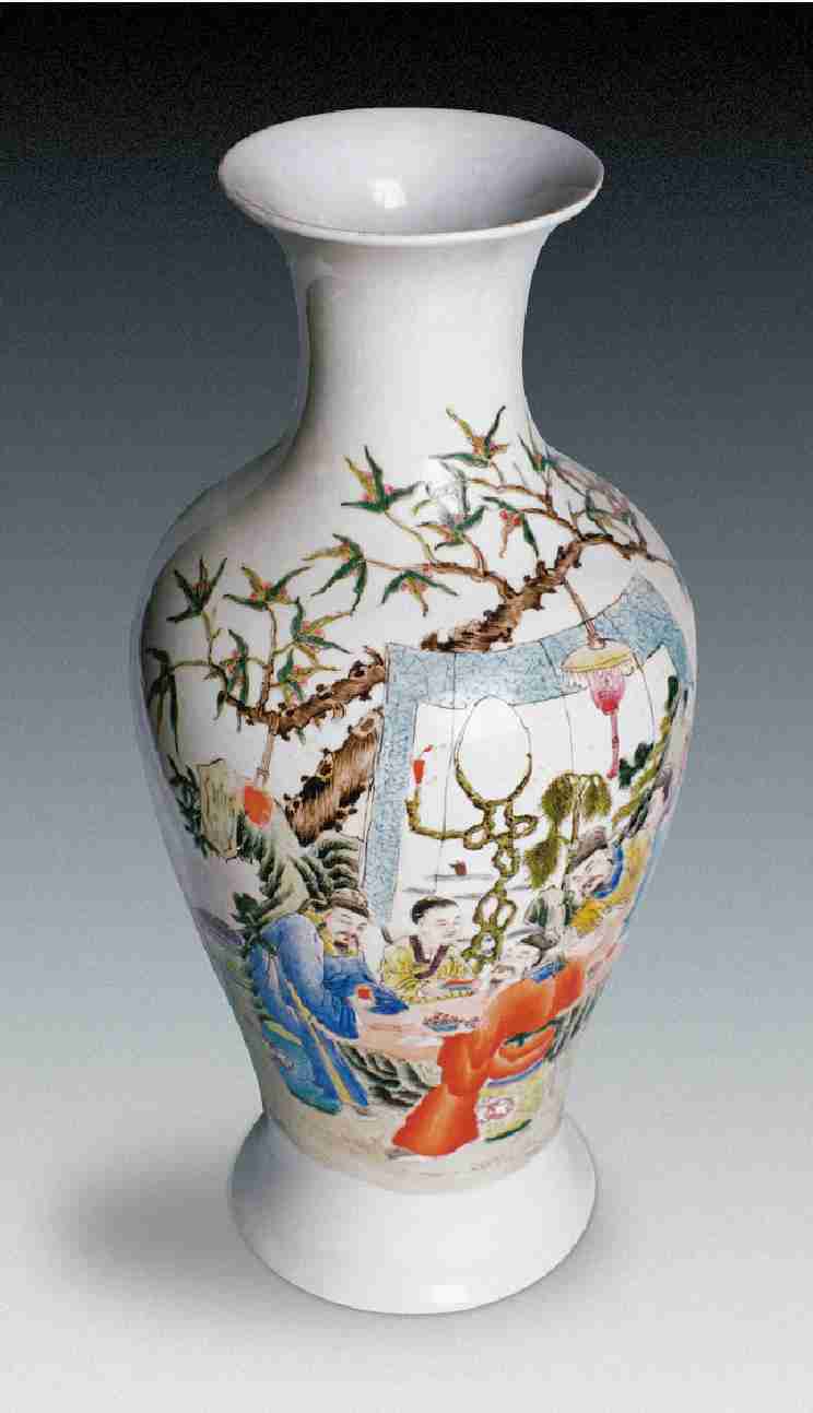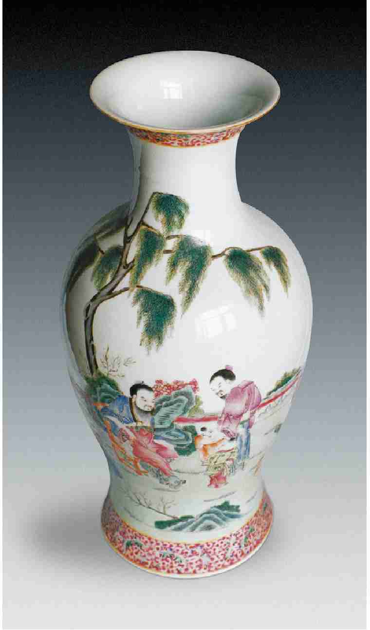 我存有两只观音瓶,两只一般高,都是“150 件”。一只是民国细粉彩,另一只却是现代仿品,一真一假,各有来历。民国细粉彩人物观音瓶购自北京。胎体细腻,釉面光洁,白中泛青,手感甚佳。上绘白发苍苍的老者、骑马的壮年、天真可爱的童子、绣花的女红和侍女,共 9 个人物,似教子题材,人物神态不一,生动毕肖。尤其是对童子个性的刻画,已臻极佳之境,其乐融融,其味津津。山石、栏杆、柳树、芭蕉,色彩润雅,清丽动人。此瓶卖家索价 1.5 万元。经过一番砍价,以 8000 元购得。这件东西被我看好,同道也都认为不错,陶瓷鉴定家徐静修老师一次来我家做客,顺便“过一眼”,亦断为民国细粉彩无疑。