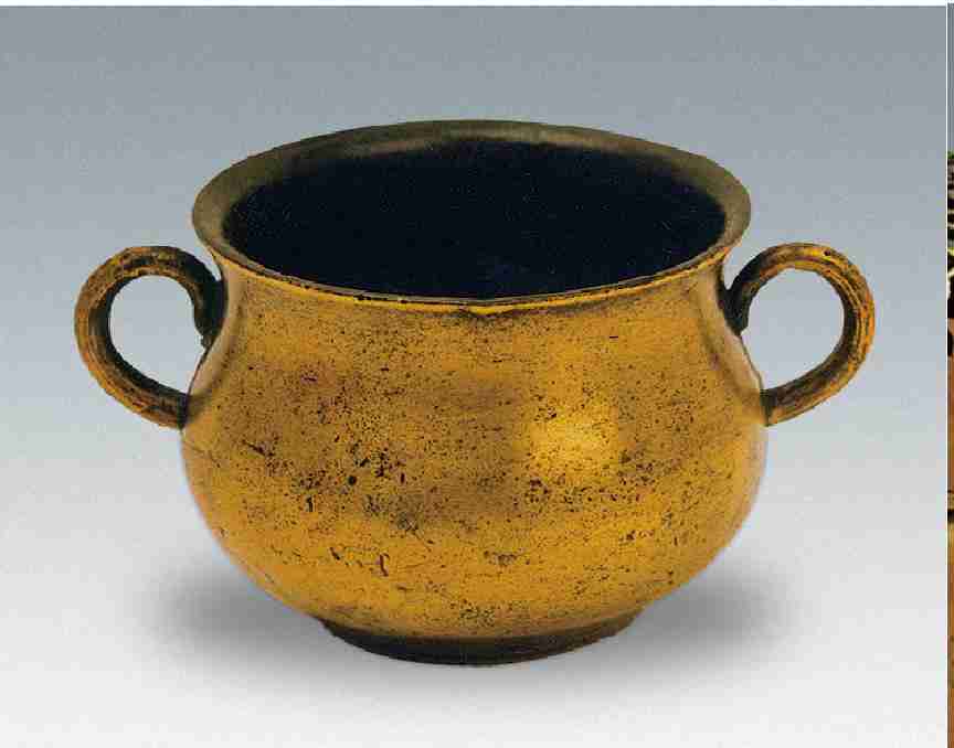 当然,我这里所说的清理,主要是去除污垢,是为了显露包浆,决不是破坏包浆,更不能将包浆清掉。因新品伪作,炉体多无包浆。包浆不仅是判定铜炉真伪的标志,也是古代铜炉给人的一种美感。有人管包浆说成宣德炉身上的“宝”,从一定意义上道出了包浆的珍贵。正因为如此,我才把“包浆”和“鎏金”放在一起来写。