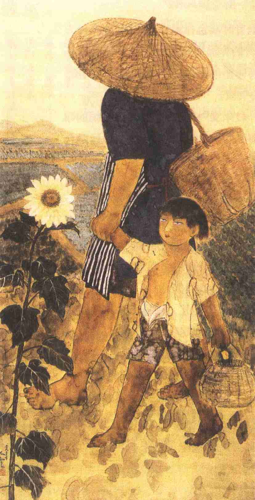 首先是画面立意构图的耳目一新。作品描绘的是一对农家母子正携手往田间去劳动的朴素场景,但画家采纳了西洋焦点透视法,以仰视角度表现人物,视平线拉得很高,使画中人物显得特别高大。画家捕捉的是母子二人大步行走的姿态:迈开的双腿,挥动的臂膊,一高一低构成“从”字形稳定有力的构图。而人物造型则经过了夸张式的概括,对肢体、衣褶的勾勒都极精练,细笔单线的轮廓处理能突出浑圆的体量感和朴厚壮硕的特征,使画面支撑丰满,充盈生命的力度美。寥寥数笔勾画出的孩童的圆脸和白得发光的晶晶瞳目直面着向日葵,闪烁出强烈的动感,这成了整幅作品的“画眼”。