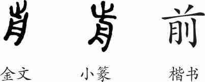 “前”是形声字。金文从刀,歬声。小篆与金文大致相同。隶变后楷书写作“前”。