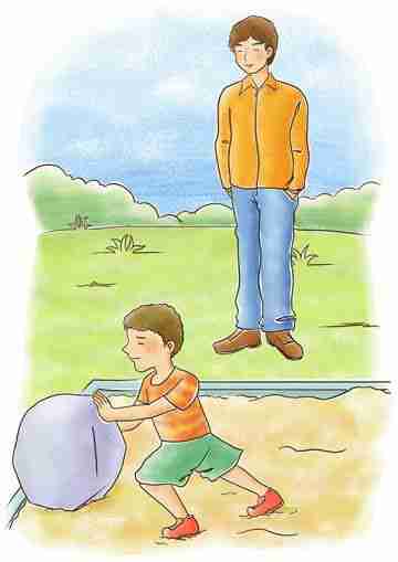 一个六七岁的小男孩在一个沙坑里玩,他想把一块大石头从沙坑里推出来,但他的力气跟石头的重量相比实在太小,他费了九牛二虎之力也办不到。孩子开动脑筋,一会儿在石头下面挖,一会往沙坑的边缘填沙子,但最后他还是不能把石头推上来。小男孩终于失去了耐心,禁不住发起了脾气。他的父亲看到了,走过去说:“你生气没有用,倒不如再想想办法。”男孩说:“我所有的办法都想到了。我想把石头垫高,但没用;我想把沙坑填得浅些,但也没用。”父亲说:“很显然,你并没有用上所有的办法,例如你可以向我求助,这就是解决问题的一个办法,但你没想到。”父亲边说,边双手用力,把石头推出了沙坑。