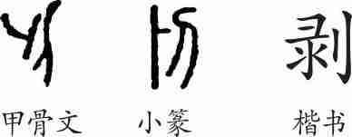 “剥”是会意兼形声字。甲骨文从刀从卜会意,卜兼表声。小篆一形整齐化;二形改为从刀从录(刻录)会意,录兼表声。隶变后楷书写作“剥”。