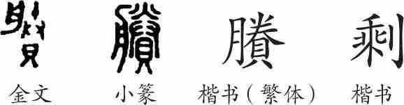 “剩”是形声兼会意字。金文从貝,朕声,朕兼表陪送之意。小篆整齐化。隶变后楷书写作“賸”,汉字简化后写作“剩”。