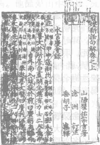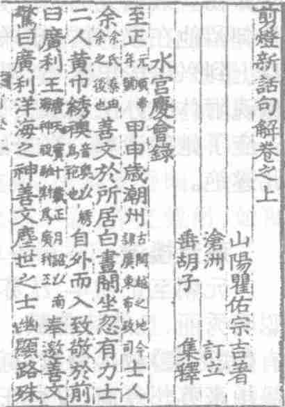 明代文言短篇传奇小说集。四卷二十篇,附录一卷一篇。题“山阳瞿佑宗吉著,沧洲订立,垂胡子集释”。瞿佑(1347—1433),字宗吉,号存斋,钱塘人。成书于明洪武三十一年(1378)。