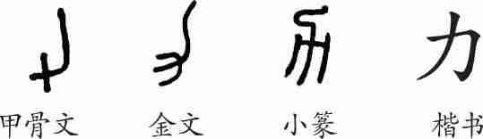 “力”是象形字。甲骨文、金文都像古人犁地用的工具“耒”的形状。小篆整齐化。隶变后楷书写作“力”。