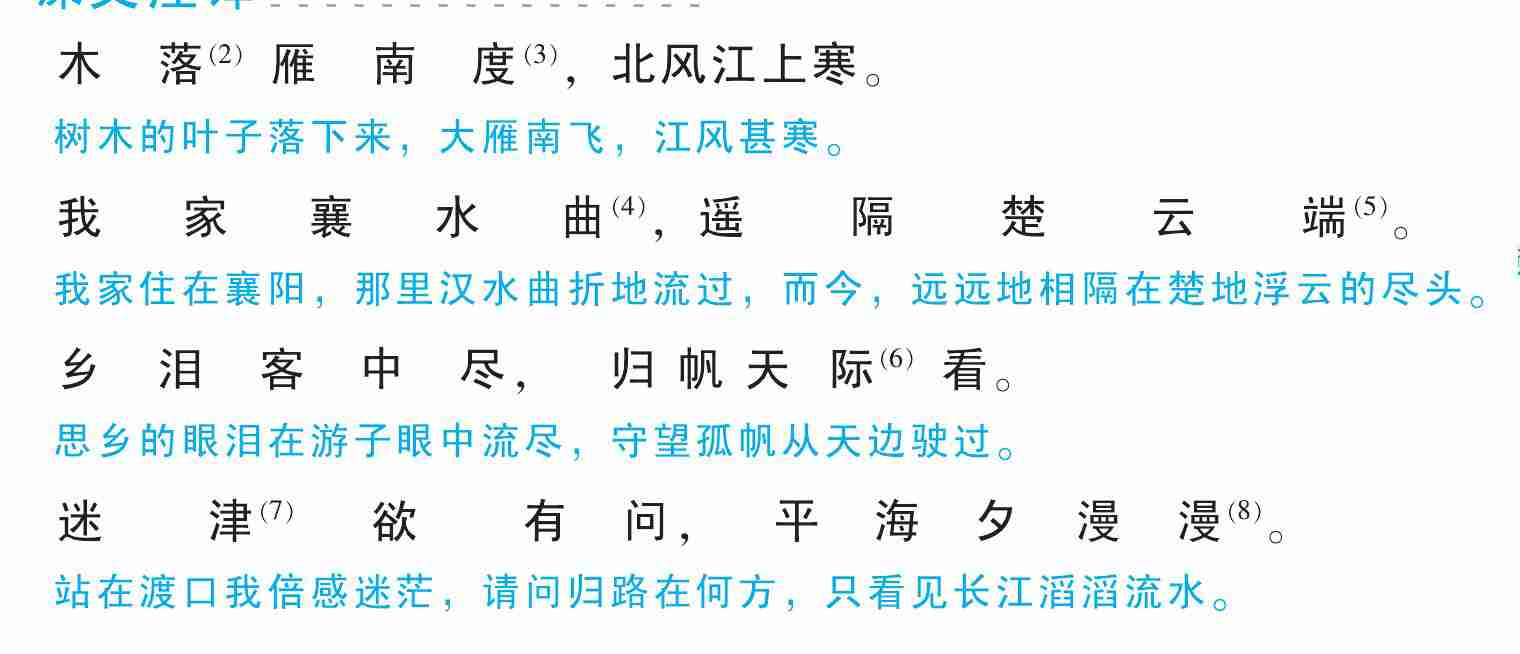(1) 选自 《孟浩然集》。 (2) 〔木落 〕 树木的叶子落下来 。 (3) 〔雁南度 〕 大雁南飞 。 (4) 〔襄 (xiāng)水曲〕, 在汉水的转弯处。 襄水, 指汉水, 流经孟浩然的家乡襄阳 (现在属湖北)。 曲, 曲折。 (5) 〔楚云端〕 长江中游一带云的尽头。 (6) 〔天际〕 天边。 (7) 〔迷津〕 迷失道路。 津, 渡口。 (8) 〔平海夕漫漫〕 形容长江水势很大。