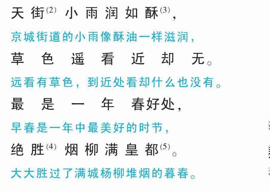 (1) 选自 《韩愈诗选》。 此题共两首, 这里选的是第一首。 张十八员外, 指张籍 (766? —830?), 唐代诗人。在同族兄弟中排行十八, 曾任水部员外郎。 (2) 〔天街〕 京城街道。 (3) 〔酥〕 乳汁, 这里形容春雨的滋润。(4) 〔绝胜〕 远远胜过。 (5) 〔皇都〕 帝都。