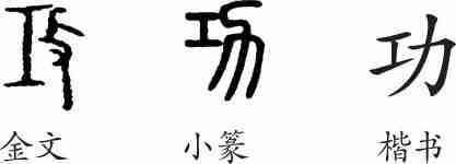 “功”是会意兼形声字。金文从攴(表操作),从工(表版筑墙),会从事盖房等各种各样的工作之意,工兼表声。隶变后楷书写作“功”。