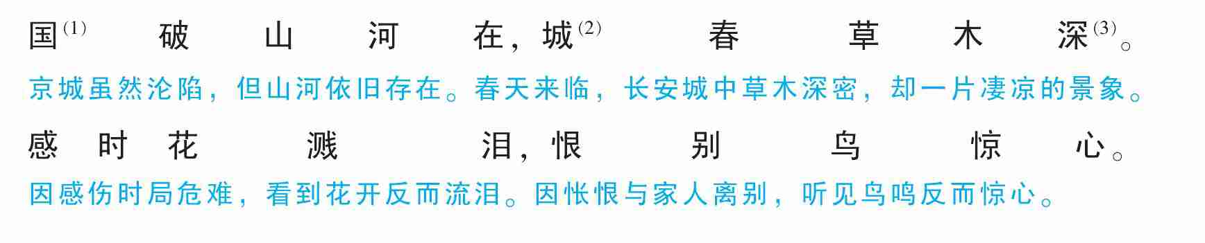 (1) 〔国〕 国都, 京城, 这里指长安。 (2) 〔城〕 长安城。 (3) 〔深〕 茂盛, 繁多。(4) 〔烽火 〕 古时边防报警烟火 , 这里指安史之乱的战火 。 (5) 〔抵 〕 值 。 (6) 〔白头 〕 白发 。 (7) 〔搔 〕抓, 挠。 (8) 〔短〕 少。 (9) 〔浑〕 简直。