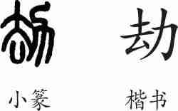 “劫”是会意字。小篆从力,从去,会强力阻止人去之意。隶变后楷书写作“劫”。