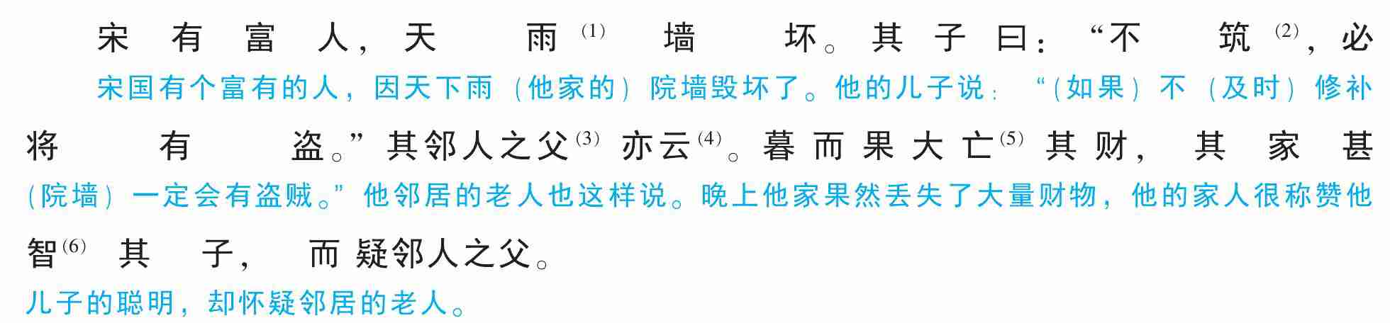 宋有富人,天雨墙坏。其子曰:“不筑(2),必将有盗。”其邻人之父(3)亦云(4)。暮而果大亡(5)其财,其家甚智(6)其子,而疑邻人之父。
