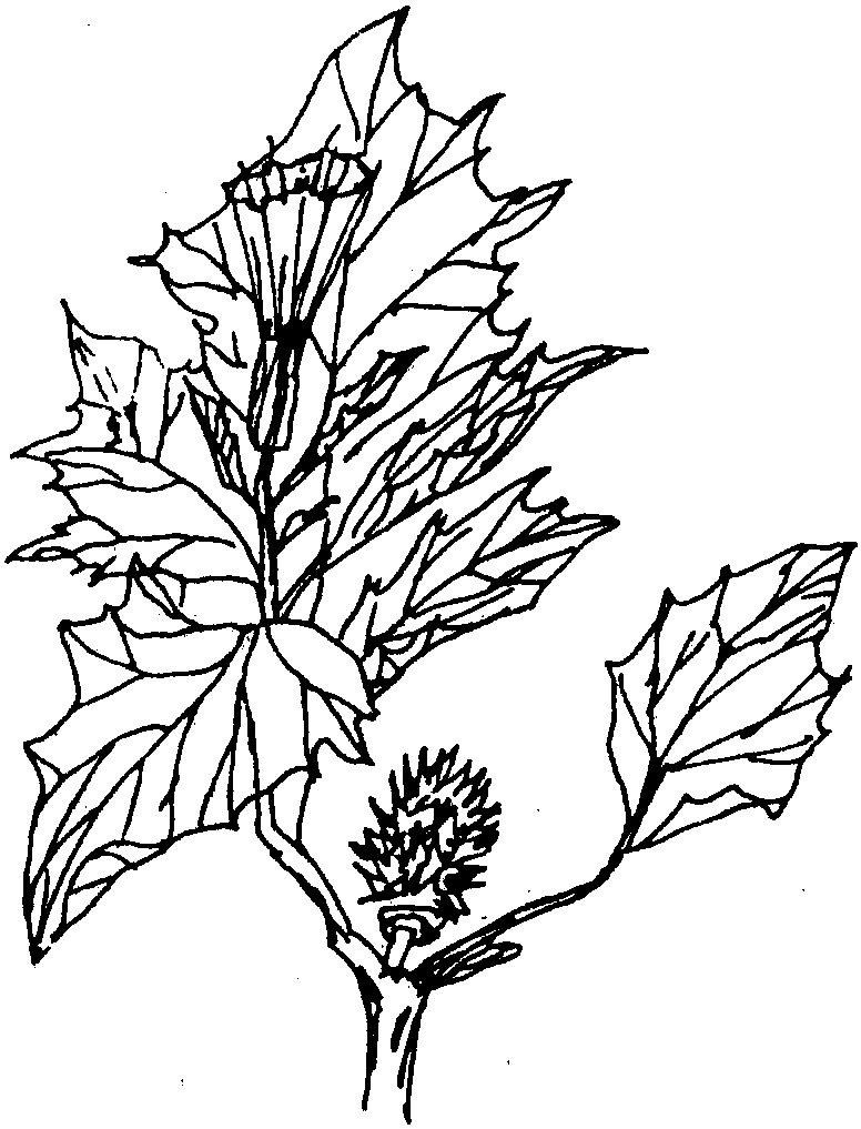 《本草纲目》记载:“曼陀罗生北土,人家亦栽之。春生夏长,独茎直上,高四五尺,生不旁引,绿茎碧叶,叶如茄叶。八月开白花,凡六瓣,状如牵牛花而大。攒花中坼,骈叶外包,而朝开夜合。结实圆而有丁拐,中有小子。八月采花,九月采实。”