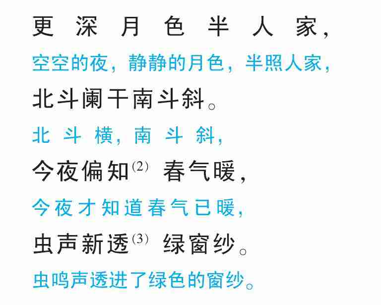 解题: 这首诗写诗人在初春的深夜中所见所感。 初春深夜, 星斗横斜, 虫声透窗而入, 让诗人感觉到大地回春、 万物复苏的一片生机。