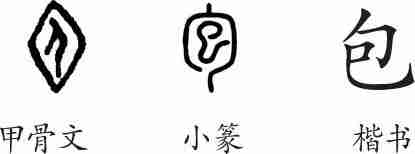 “包”是会意字。甲骨文像人腹中有子的样子。小篆外边是“勹”,是人曲身有所包裹之意,会胎胞之意。隶变后楷书写作“包”。
