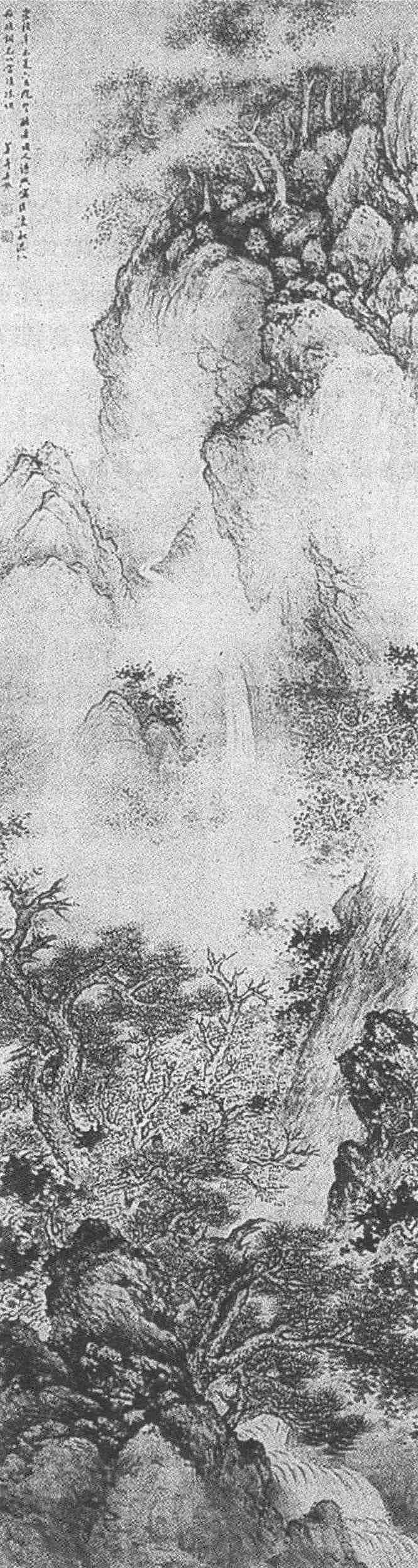 画上部系截取山腰陡壁一段,矾石垒堆,石间丛林茂密,雾气掩映树巅。画面中部为飞瀑倒挂悬崖,雾气掩其脉,峡谷迷濛,山石树木似隐似现。飞流直下,空谷回响。画面下部偏左为近景,乃截取近山一角,全画的最费笔墨的形象集中于此。山石嶙峋,其上布满长松巨木,盘根错节,或作扭曲攫拿之势,或作迎风狂舞之态,有的冲天而立,有的伸入深谷,有的叶已脱尽,仅剩老干枯枝,飞瀑沿峡谷奔腾而下,肃杀气氛扑面而来,如闻松涛吼、飞瀑响。环境之险绝,气候之变幻,可想而知。画面下部偏右,乃截取山崖一角,陡石刺天,其上杂木繁茂,其后雾气迷濛。自近及远,层层虚淡。