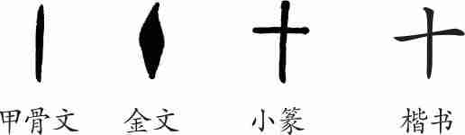 “十”是指事字。甲骨文字形为“丨”,用一根树枝代表十。金文像结绳记数,用一个结表示十。小篆符号化,一点变成了一横。隶变后楷书写作“十”。