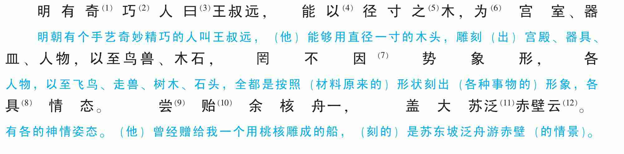 皿、人物,以至鸟兽、木石,罔不因(7)势象形,各具(8)情态。尝(9)贻(10)余核舟一,盖大苏泛(11)赤壁云(12)。