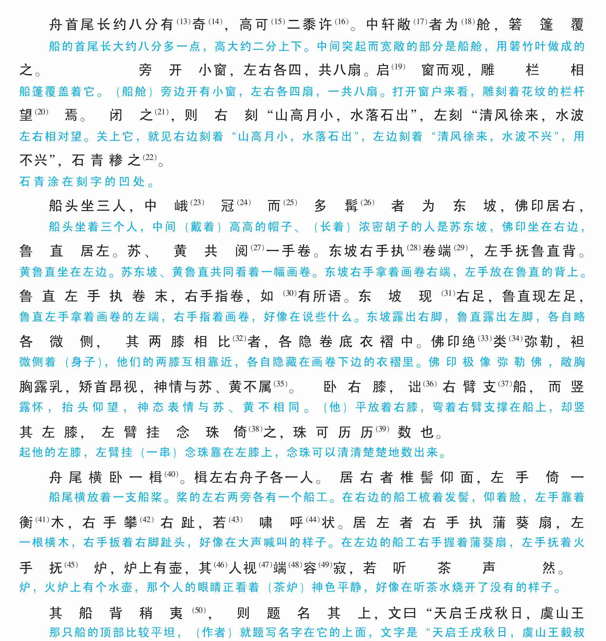 船头坐三人,中峨(23)冠(24)而(25)多髯(26)者为东坡,佛印居右,鲁直居左。苏、黄共阅(27)一手卷。东坡右手执(28)卷端(29),左手抚鲁直背。鲁直左手执卷末,右手指卷,如(30)有所语。东坡现(31)右足,鲁直现左足,各微侧,其两膝相比(32)者,各隐卷底衣褶中。佛印绝(33)类(34)弥勒,袒胸露乳,矫首昂视,神情与苏、黄不属(35)。卧右膝,诎(36)右臂支(37)船,而竖其左膝,左臂挂念珠倚(38)之,珠可历历(39)数也。