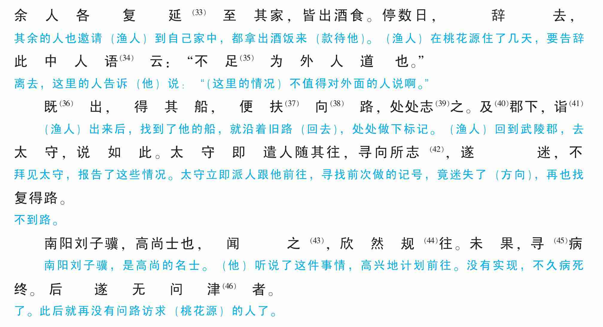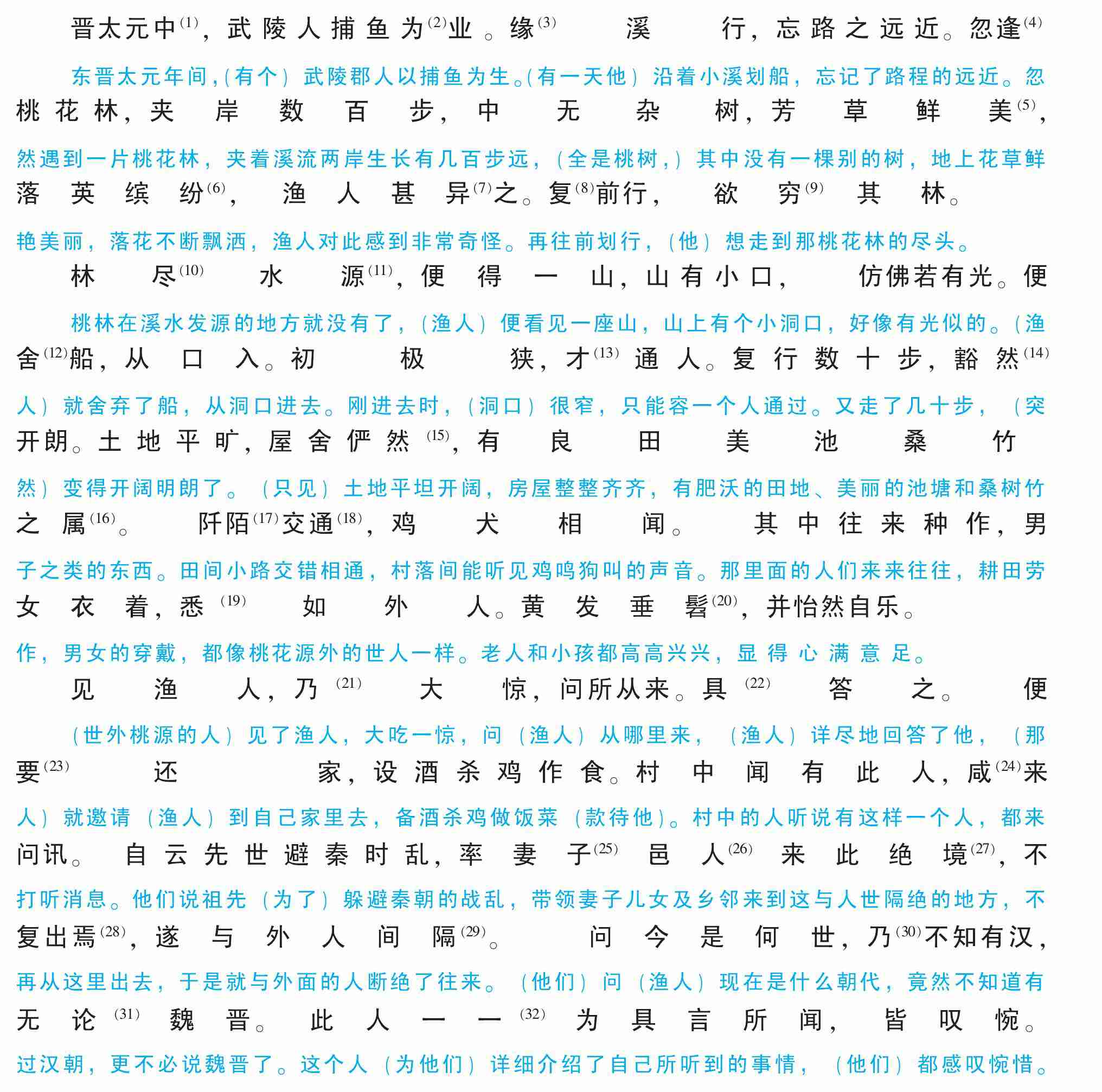 见渔人,乃(21)大惊,问所从来。具(22)答之。便要(23)还家,设酒杀鸡作食。村中闻有此人,咸(24)来问讯。自云先世避秦时乱,率妻子(25)邑人(26)来此绝境(27),不复出焉(28),遂与外人间隔(29)。问今是何世,乃(30)不知有汉,无论(31)魏晋。此人一一(32)为具言所闻,皆叹惋。余人各复延(33)至其家,皆出酒食。停数日,辞去,此中人语(34)云:“不足(35)为外人道也。”