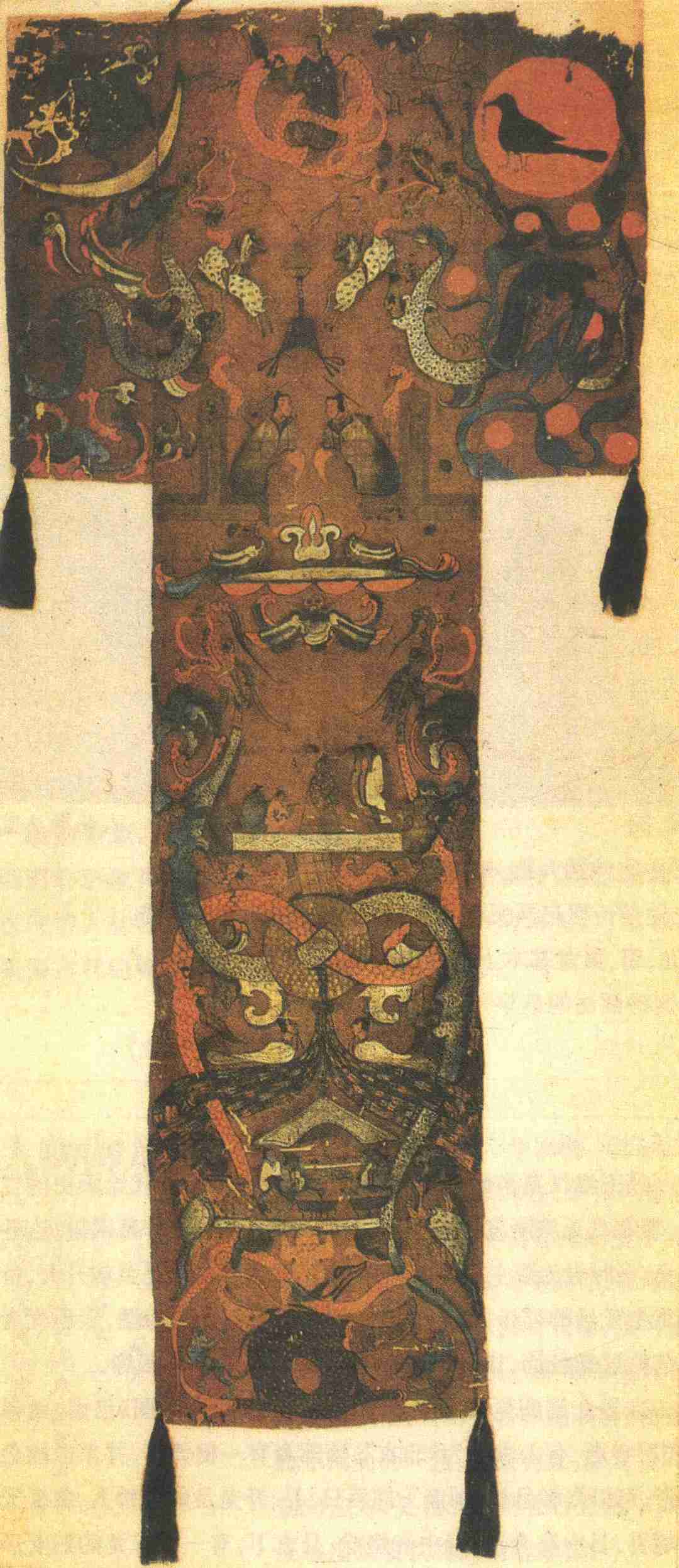 这里介绍的是1972年出土于一号墓的《升天图》帛画,画幅呈“T”字形,有人称之为“非衣”。顶部裹有一根竹竿,并系以棕色丝带,可以张举悬挂。画面上部画日、月、升龙及蛇身神人,象征天上境界。日中有金乌,月中有蟾蜍。月之下,有一乘应龙的妇女形象,一说“嫦娥奔月”,一说“死者的灵魂升天”。此外,还有仰首而鸣的仙鹤,一举千里的鸿雁,两个兽首人身的司铎骑在异兽上振铎作响,八个小太阳坐落扶桑树间,天国的门口,则有神人和神豹守卫,瑞云缭绕,真可谓气象万千。帛画的中间部分表示人间,以墓主人的形象和祭祀活动为中心,饰以谷璧交龙,华盖玉磬,以及神兽、仙禽,构成一个特殊的布局,向天界冉冉欲升。墓主人即轪侯利仓之妻,她穿着锦衣,拄杖而行,前有两仆人捧案跪迎,后随之侍女,气派十足。下面厅堂里,设有鼎、壶、舫及耳杯之类的酒器食具,左右各有三人拱手而坐,另一人在侧,意为主人将别家园上天,家人设宴送别。画的下部绘地下境界,一神人以双手抵地,疑是地祗,又画有鱼龙水属之类,表示此处为黄泉(九泉)。整个