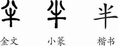 “半”是会意字。金文从八(表示分),从牛,会把一头牛分成两部分之意。小篆的形体基本上同于金文。隶变后楷书写作“半”。