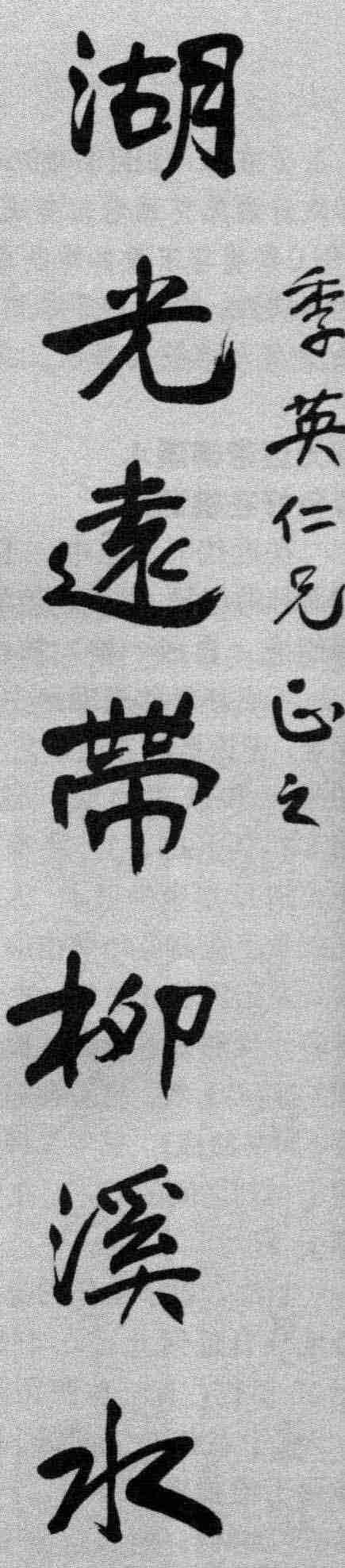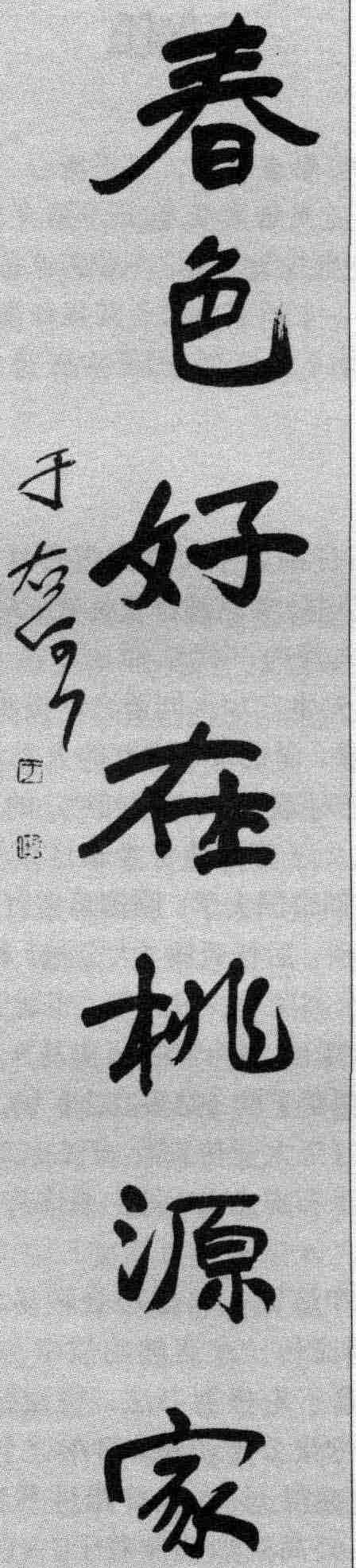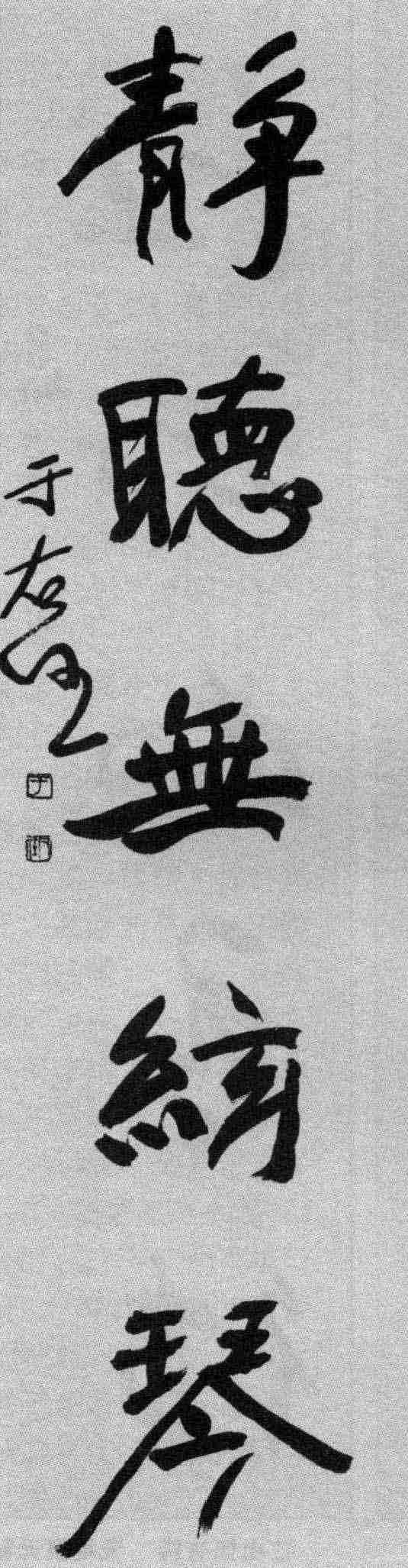 于右任书法造诣精深,有“草圣”之誉。他早年常以洒脱的木简书来写北碑,别具神韵。晚年热心“标准草书” 的研究,归依二王,追求以简便美观为标准的通用草书,并编有 《标准草书千字文》 等。此联正代表他后期草书的风韵,顾盼生姿、潇洒自如,从内容上看也颇能体现于右任的心性和襟怀。也有人评论于右任晚年的草书楹联,说: “若以代表于氏一生水平的,当不以晚年之所书为准,因虽求平淡,略嫌草率,不似其中期写碑书风既有‘气’、‘韵’,又具‘文’、‘质’。”这是从另一个角度品评于右任的书联。