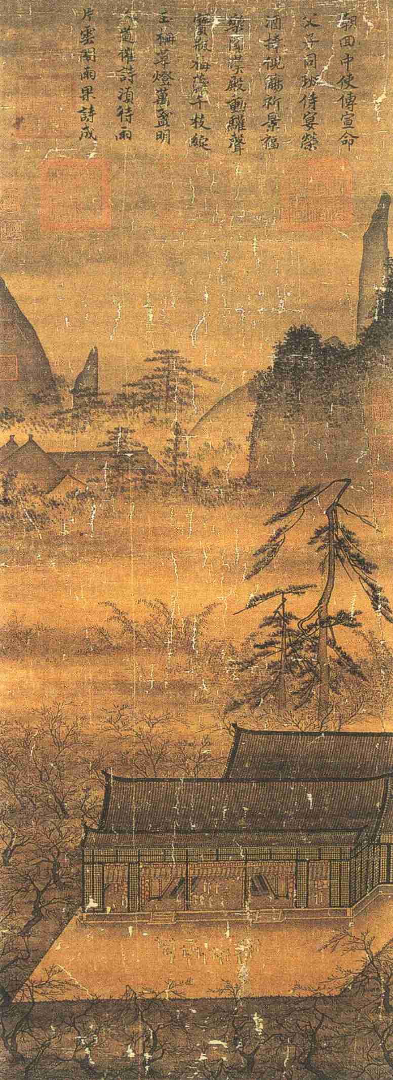 画面下部画两重广厦,前排五楹,华灯初上时分,堂内左右两室各有两女侍立,中室有穿官服者七恭候,画面未出现主人形象。堂前平台上十六名舞女,排列错落有致,执灯而舞。一丛丛梅树环绕着这组建筑物的前后左右,两棵古松耸立于后;远山叠嶂,屋宇映盖其间,前后景之间以云烟过渡,产生深远的空间感。广厦、平台的灯光与远山的黝暗比照,颇有夜色苍茫之感。画上方题:“朝回中使传宣命,父子同班侍宴荣。酒捧倪觞祈景福,乐闻汉殿动欢声。宝瓶梅蕊千枝绽,玉栅华灯万盏明。人道催诗须待雨,片云阁雨果诗成。”画面左下边款署:“臣马远”。