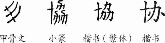 “协”是会意字。甲骨文像三耒(犁具)并耕之形,会合力同耕之意。小篆又加上义符“十”,表示“众多的力”。隶变后楷书写作“協”。汉字简化后写作“协”。