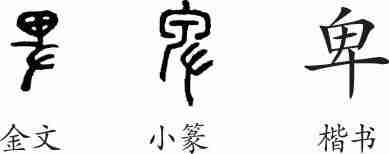 “卑”是会意字。金文像左手持一粗糙的酒器之形,会执事供役使之意。小篆上边的酒器讹为“甲”。隶变后楷书写作“卑”。