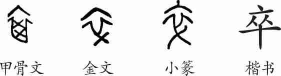“卒”是会意字。甲骨文从衣,会带有标记的衣服之意。这是古代隶役人穿的一种衣服,用标记以示区别。金文将标记简化为一斜道。隶变后楷书写作“卒”。
