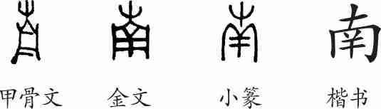 “南”是象形字。甲骨文的字形像悬挂着的敲击乐器:上边是悬挂的结,下边是器体。金文和小篆都是由甲骨文直接演化而来。隶变后楷书写作“南”。