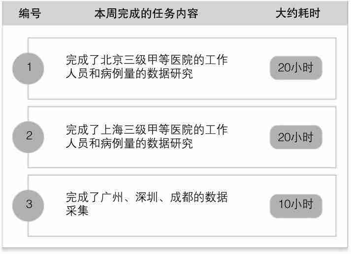第二,这份报告里写了具体完成的事情。“上海三级甲等医院”这样的具体说明就比“完成了上海数据调研”要好得多。