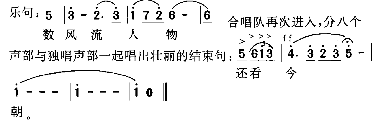 歌曲进入第二部分——诗人抒怀的篇章。叙事般的咏唱,苍劲含蓄,音乐语言准确显示出毛泽东作为一代伟人的气度、指点江山、评说历史。在活跃跳动的乐队伴奏下平稳地歌唱。“俱往矣”一声长叹,历史长卷一翻而过,音乐急转直下,速度突起,汹涌奔腾:“数风流人物,还看今朝”反复数次,不断向高声区推进,突然合唱队在强音量上戛然而止,男中音独唱唱出全曲最激动人心的高潮