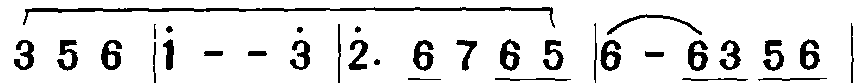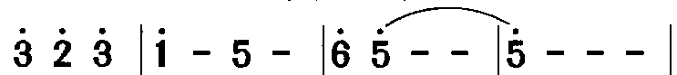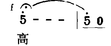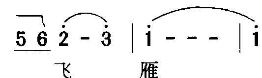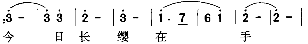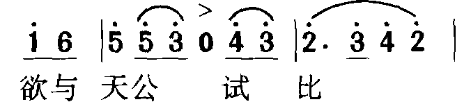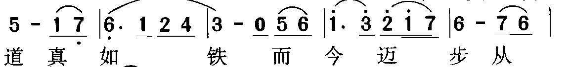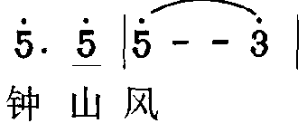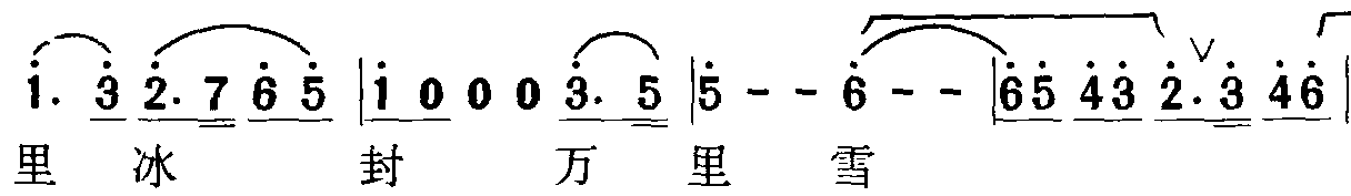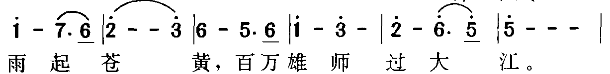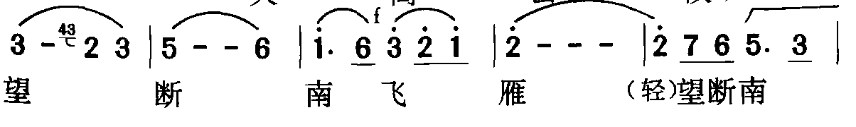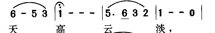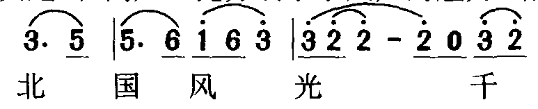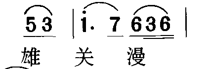 “娄山关”一曲的前奏长达四十五小节,写得丰富多彩。三个短促强烈的和弦揭示了紧张悲壮的场面,紧接着弦乐奏出一串沉重凄凉的下行旋律,大大渲染了战斗气氛,杀机四起,硝烟方散。主题在B大调上由弦乐声部中速奏出: