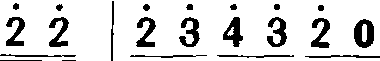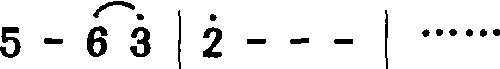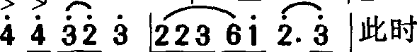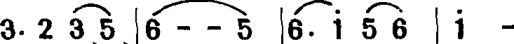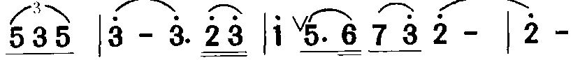 的紧缩句,“万水千山只等闲”句,在第一句旋律上作了一个小小的发展,效果更为高亢些。接着,小号再次吹响冲锋号般的间奏,音乐进入主部,男高音独唱在合唱队的伴唱下唱出了大家熟悉的坚定情绪的旋律:![]()