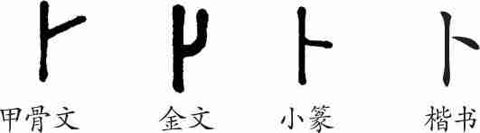 “卜”是象形字。甲骨文像用火烧龟甲或兽骨所形成的横斜交错的裂纹。金文、小篆与甲骨文大致相同。隶变后楷书写作“卜”。