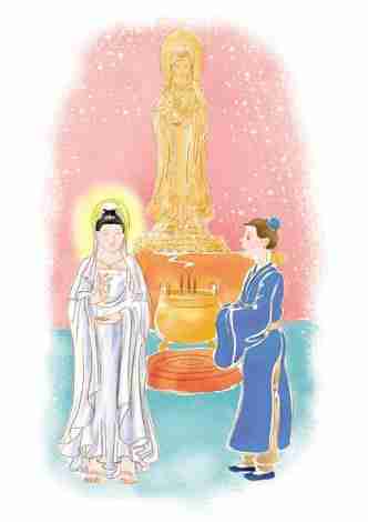 第二天,这人遇到难事,便去庙里拜观音。走到庙里,发现观音像前有一个人正在参拜。等那个人参拜完毕抬起头来,他发现那人正是观音菩萨。