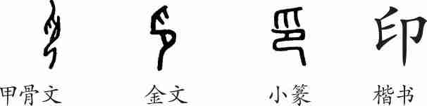 “印”是会意字。甲骨文像一只手按压着一个人之形。金文整齐,小篆的书写就更加规范了。隶变后楷书写作“印”。