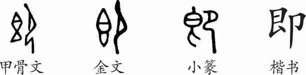 “即”是会意字。甲骨文左边是一件食器,盛满了食品;右边是跪坐着一个人,正要饱餐。金文与甲骨文大致相同。小篆线条化。隶变后楷书写作“即”。