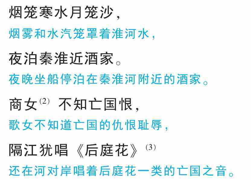 (1)选自 《樊川文集》, 杜牧 (803—852), 字牧之, 京兆万年 (现在陕西西安) 人。 唐代诗人。 秦淮, 河名,发源于江苏溧水东北, 经南京流入长江。 (2) 〔商女〕 歌女。 (3) 〔后庭花〕 《玉树后庭花》 的简称。 南朝陈后主所作, 后世多称为亡国之音。